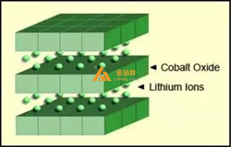 其高比能量使钴酸锂成为手机, 笔记本电脑和数码相机的热门选择。 电池由氧化钴阴极和石 墨碳阳极组成。 阴极具有分层结构, 在放电期间, 锂离子从阳极移动到阴极, 充电过程则流动方向相反。结构形式如下图所示。