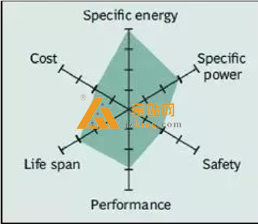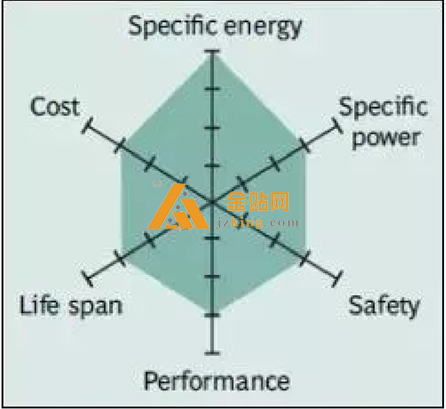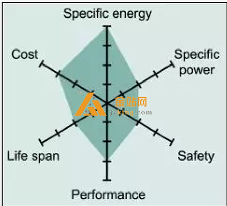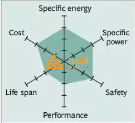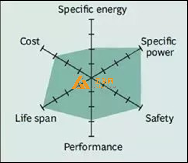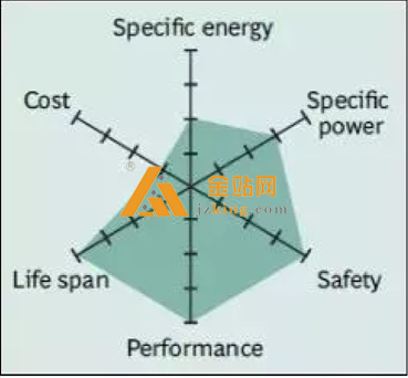 本特性。 蜘蛛图中没有显示的其他重要特征还包括毒性, 快速充电能力, 自放电和保质期。