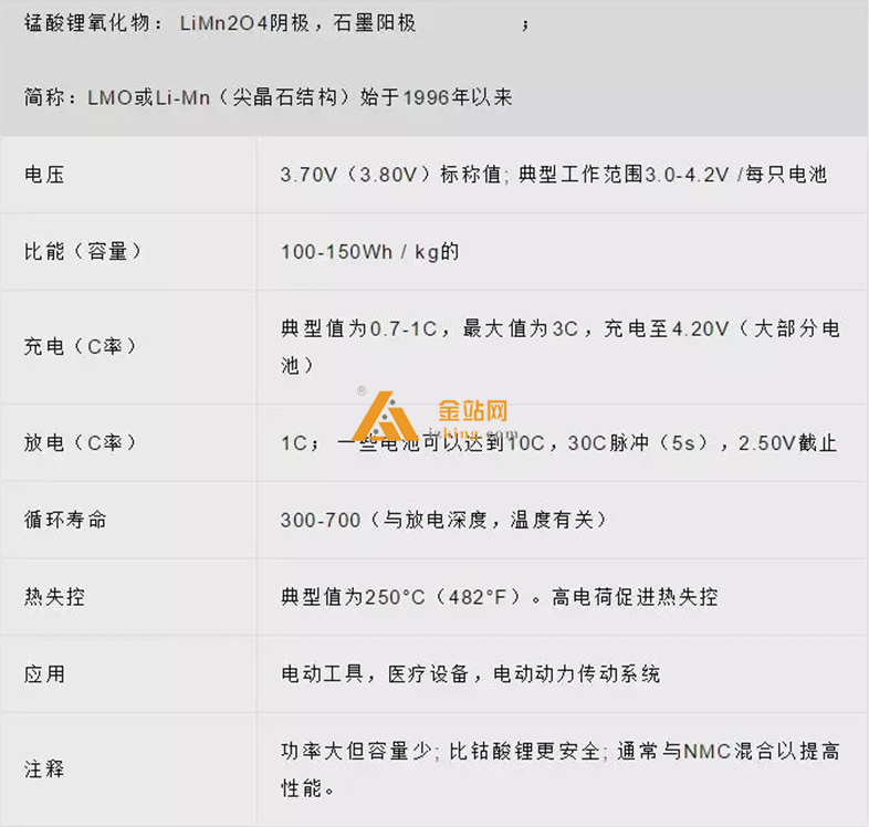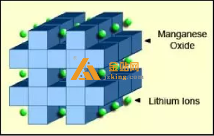 锰酸锂阴极结晶形成具有在化成后成型的三维骨架结构。 尖晶石提供低电阻, 但比能量低 于钴酸锂。