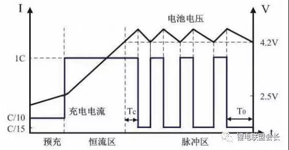 在恒流充电过程中以恒定电流对电池进行充电,大部分能量被转移到电池内部。当电池电压上升到上限电压(4.2V)时,进入脉冲充电模式:用1C的脉冲电流间歇地对电池充电。在恒定的充电时间Tc内电池电压会不断升高,充电停止时电压会慢慢下降。当电池电压下降到上限电压(4.2V)后,以同样的电流值对电池充电,开始下一个充电周期,如此循环充电直到电池充满。