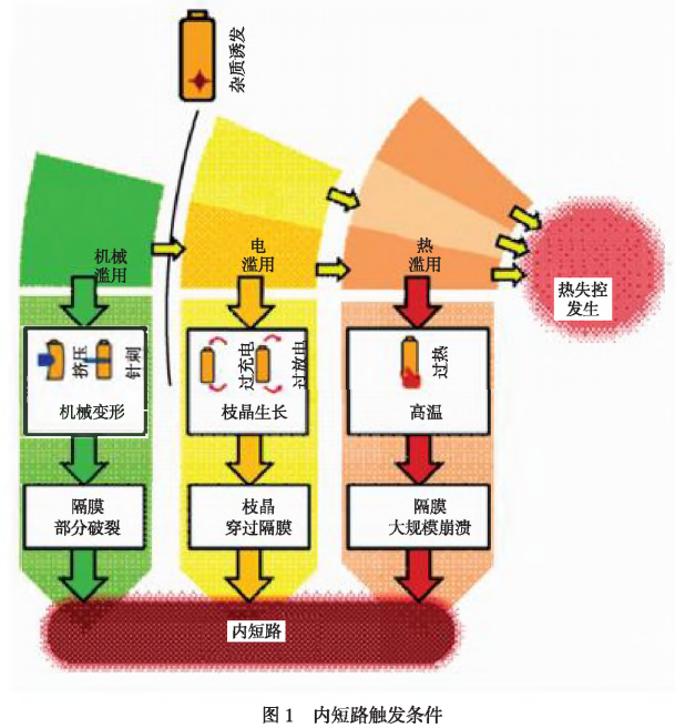 锂离子电池在实际工作的充放电复杂工况中,虽然在电池能量管理系统作用下,能够尽可能实现正常运行,但是在过充、过放、过热等特殊情况下仍会发生机械滥用、电滥用和热滥用,从而引起电池性能的快速衰退,进而发生电池内短路,最后导致热失控安全问题。