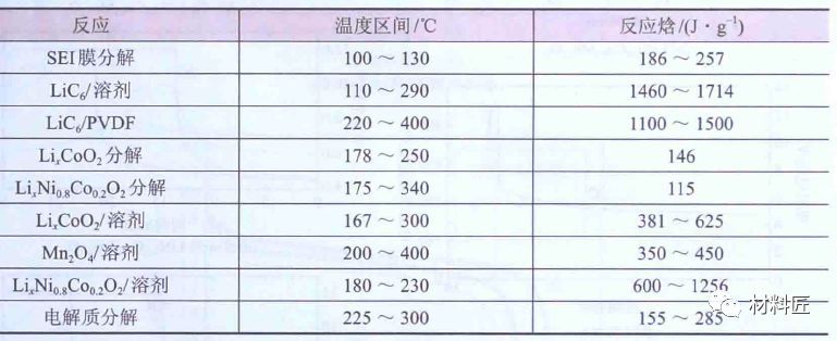由于内部短路、外部加热,或者电池自身在大电流充放电时自身发热,使电池内部温度升高到90℃~100℃左右,锂盐LiPF6开始分解;对于充电状态的碳负极化学活性非常高,接近金属锂,在高温下表面的SEI膜分解,嵌入石墨的锂离子与电解液、黏结剂会发生反应,进一步把电池温度推高到150℃,此温度下又有新的剧烈放热反应发生,例如电解质大量分解,生成PF5,PF5进一步催化有机溶剂发生分解反应等。