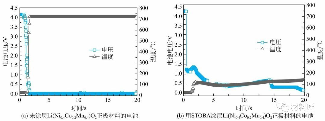 上图采用一种纳米级树枝状结构的高分子化合物(STOBA)对NCM(424)进行涂层,当锂电池发生异常,产生高温时,会形成一道薄膜阻隔锂离子间的流动,稳定锂电池,借以提高电池安全度。由下图可见,针刺实验时,正极材料未涂STOBA涂层的电池内部温度在几秒钟内升至700℃,而用STOBA涂层正极材料的电池温度最高只有150℃。